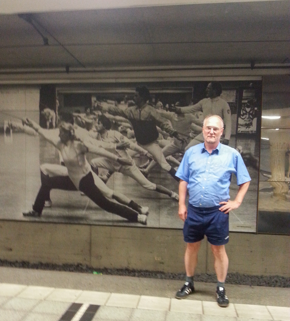 „Das Patinando besteht aus Schritt vorwärts und Ausfall und wird häufig bei langen Angriffen angewandt, die sich aufgrund von Passivität des Gegners erforderlich machen. Es ist eine dreitempige Bewegungskombination, bei der der Schritt vorwärts (zweitempig) mit ansteigender Geschwindigkeit ausgeführt wird und an den sich der Ausfall mit maximaler Geschwindigkeit anschließt.“ Sport A–Z. Lexikon sportwissenschaftlicher Begriffe, https://spolex.de/lexikon/patinando/, Zugriff 21.5.2024. Zum besseren Verständnis demonstrierte Elke Vogt beim Treffen vor der Fotowand im U-Bahnhof den Stadtteil-Historikern die Bewegungsfolge direkt auf dem Bahnsteig, allerdings ohne Florett (!).