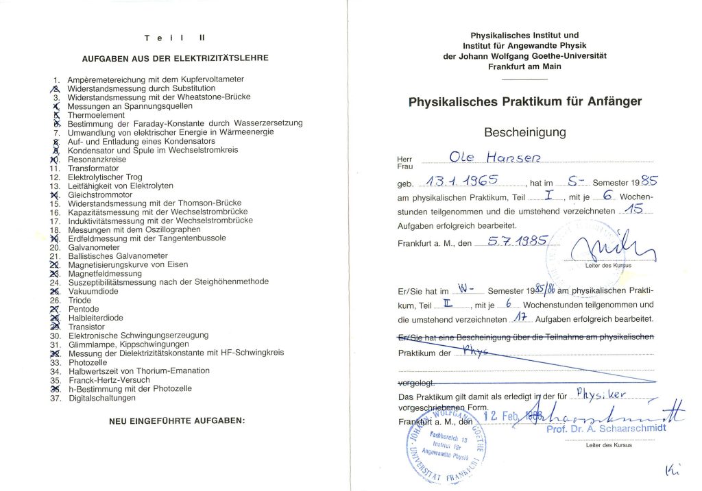 [1] Die auf dieser Seite gezeigte Kopie der Bescheinigung über die Teilnahme Ole Hansens am später erwähnte Physik-Praktikum lässt eine relativ genaue Datierung zu: das Wintersemester 1985/86. Das Vorlesungsverzeichnis der Goethe-Universität für das entsprechende Semester (https://publikationen.ub.uni-frankfurt.de/opus4/frontdoor/deliver/index/docId/11089/file/1985_wv.pdf, Zugriff am 5.6.2024) nennt jeweils 14–17 Uhr am Montag und Donnerstag bzw. Dienstag und Freitag als Veranstaltungsdaten. Die Erinnerungen unserer Interviewpartner wichen, wie auch in anderen Fällen üblich, zeitlich weit voneinander ab: vom Wintersemester 1984 (Stefan Lanz) über den Anfang 1985 (Heiner Heng) bis zum Sommer 1985 oder Winter 1985/86 (Hans-Jürgen Matschull).