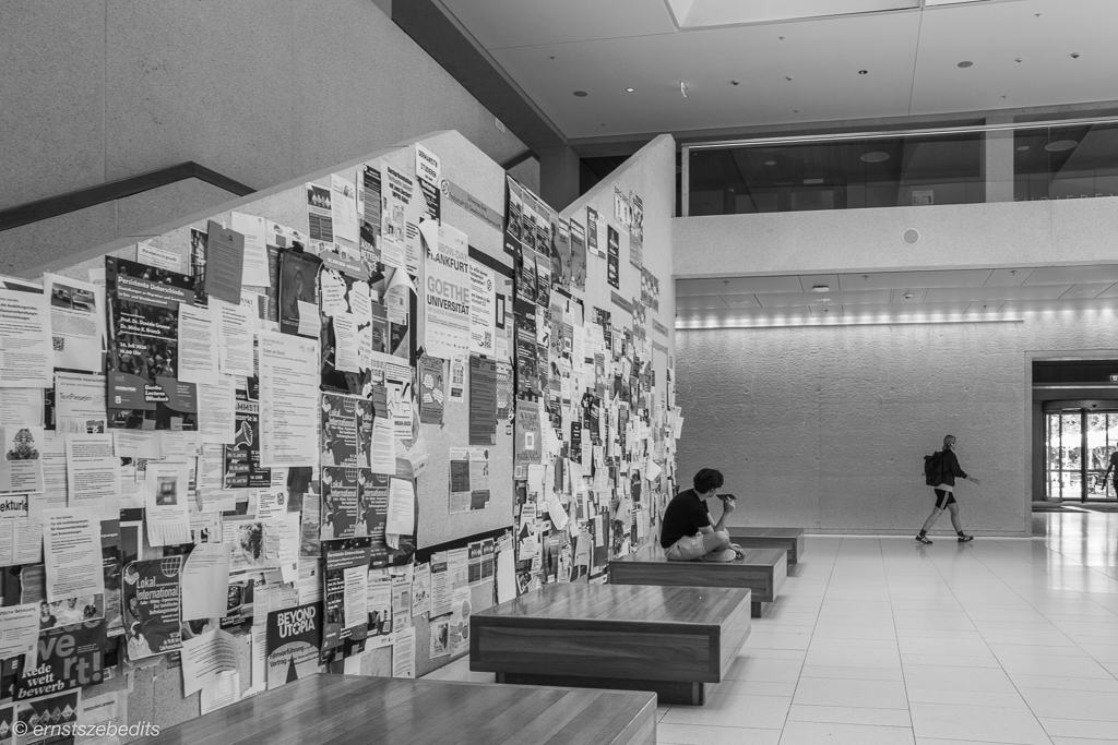 Die für die Bekanntmachungen der Hochschulangehörigen vorgesehenen Aushänge reihen sich fein säuberlich unter- und nebeneinander (wie auf dem Foto aus dem PEG-Gebäude vom Juli 2024 zu sehen) – auffällig anders als das ungeordnete Papiergewirr, vor dem der in die Lektüre vertiefte Student auf der Aufnahme Barbara Klemms hockt.